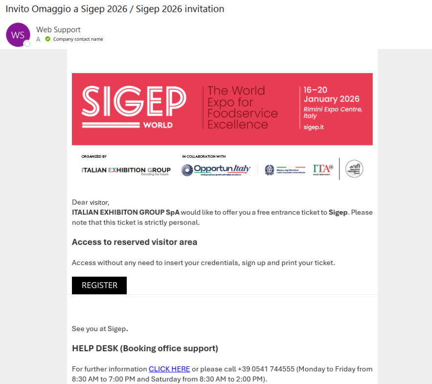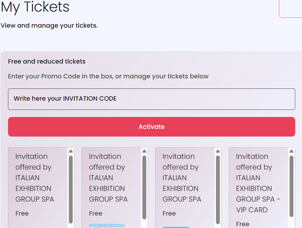 If the visitor does not receive the initial e-mail from websupport@iegexpo.it (it may unfortunately go to spam), but the invitation is among the delivered ones, the visitor can still see it in his or her reserved area by registering at this link, using the e-mail address to which the invitation was sent.